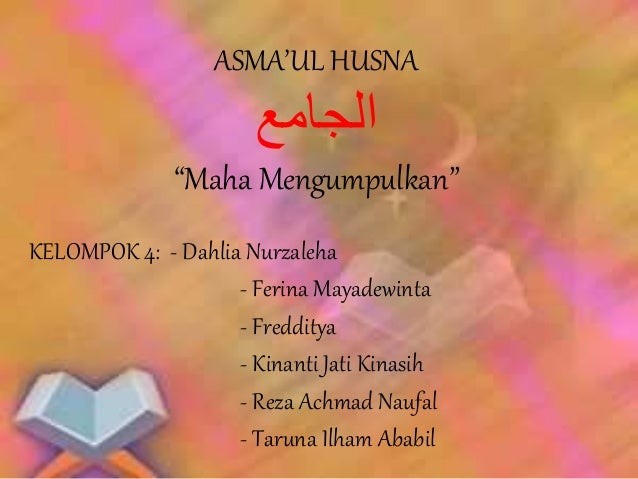 Menurut istilah Al-Jami aritinya Maha. 24122015 ASMAUL HUSNA الجامع Maha Mengumpulkan KELOMPOK 4. Perilaku Terpuji Asmaul Husna Al-Jami Sebagai bentuk pemahaman dari nama Allah Al Jami yang berarti Allah Maha Mengumpulkan mempunyai kemampuan untuk mengumpulkan segala sesuatu yang ada di langit dan di bumi seperti Manusia dikelompokkan dalam suku-suku dan bangsa-bangsa tertentu maka Silahturahmi adalah cara menjaga bentuk dari asma Allah Al-Jami.