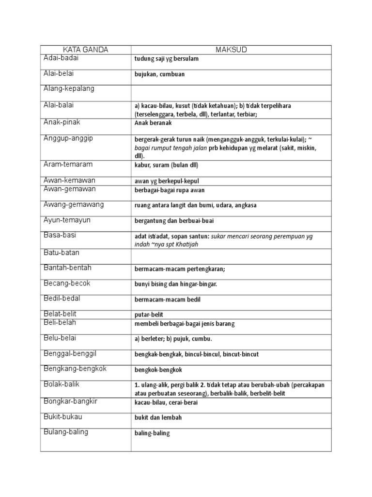 Kata ganda ialah proses pengulangan kata. KATA GANDA Adai-badai MAKSUD tudung saji yg bersulam Alai-belai bujukan cumbuan Alang-kepalang Alai-balai Anak-pinak Anggup-anggip a kacau-bilau kusut tidak ketahuan. Laluan masuk ke gua.